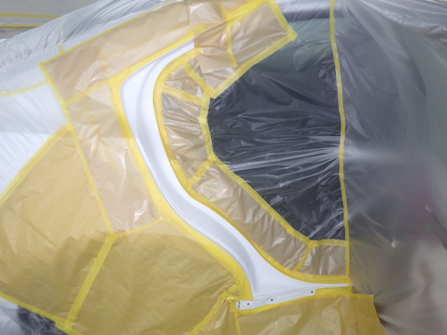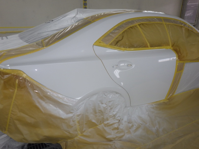 次に下地作業でサフェーサーを塗装します。下処理が終わると塗装作業です。3コートパール塗装はまず一番下の塗装を吹き、次にパールのみを吹き付けます。そして透明樹脂のトップコートクリアーを塗装します。調色作業もこの手順で作業をします。カラーデータを基に職人の目で確認しながら微調整して色を作ります。塗装ブースに車を移動してマスキングします。塗装前に塗装面をシリコンオフで脱脂します。塗装が終わりましたら塗装部分を70℃位で強制乾燥します。