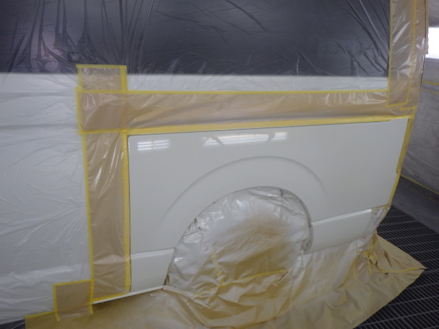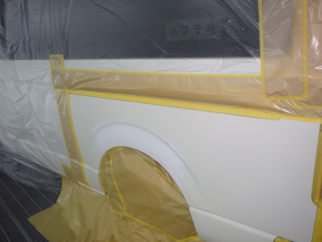 リアフェンダー・バックドアは綺麗に叩き出し、リアバンパーと共にサフェーサーを塗装しました。塗装作業工程はすべて塗装ブースと呼ばれる空気中のホコリやチリを何枚ものフィルターを通してろ過し、綺麗な空気だけが導入されたクリーンルームの塗装専用室にて行なっていきます。
