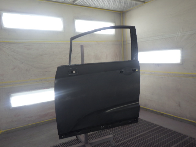 仮合せした新品のフロントドアに合わせて、損傷したフロントフェンダーの板金を丁寧に行い、限界まで鉄板を元の状態に復元させます。その後パテを塗布し加熱乾燥後、平滑に研いでさらに面を成形します。